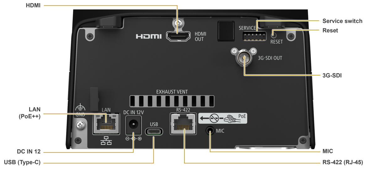 Connect seamlessly with 3G-SDI, HDMI, or IP (PoE++)—all supporting 4K60P*—plus dual XLR audio inputs for professional sound. With PoE++ support, power, control, and video transmission run over a single LAN cable, eliminating the need for separate power supplies and reducing installation complexity and costs.