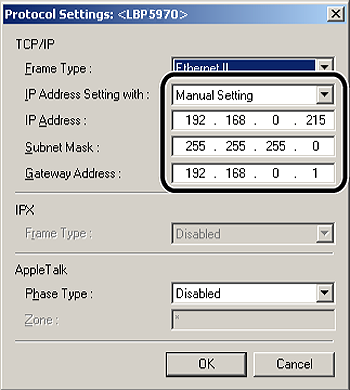 - If you specify the setting so that the IP address is automatically assigned to the printer by the functions of the DHCP server, the printer may not be able to print after you cycle the power of the printer. This is because a different IP address from the one that has been used is assigned. If you want to use the functions of the DHCP server, consult your network administrator and perform either of the following settings.