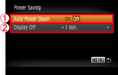 Operate the <directional buttons> left or right to set the [Auto Power Down] to [Off].