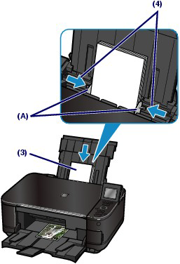 (3) Slide the Paper Guides (A) to open them, and load the paper in the center of the Rear Tray WITH THE PRINT SIDE FACING YOU.