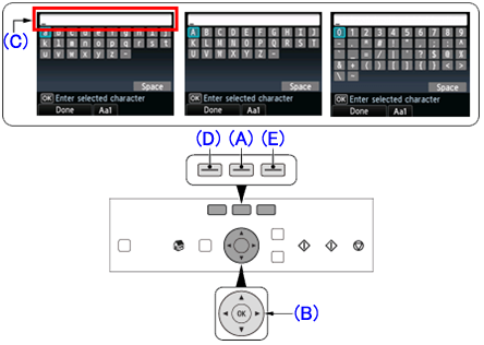 buttons (B) to select a character from the on-screen keyboard, then press the OK button to enter it.Entered characters appear in the upper section (C) of the on-screen keyboard.