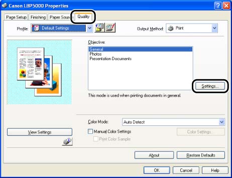2. Display the [Quality] sheet, then click [Settings].