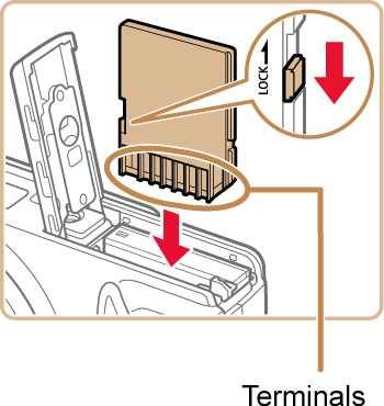 Insert the memory card facing as shown until it clicks into the locked position. Make sure the memory card is facing the right way when you insert it.