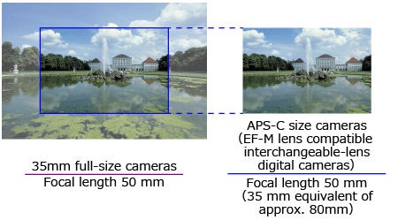 Using an EF-M lens-compatible interchangeable-lens digital camera with an APS-C-size image sensor, the replacement lens's 35 mm equivalent focal length is approximately 1.6 times greater, and the angle of view is more like that of a telephoto lens as a result. For example, if a 50 mm lens is attached to a camera with an APS-C-size image sensor, the 35 mm equivalent focal length will be approximately 80 mm.
