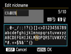 | Entering text | In the bottom area, press the < > cross keys or turn the < > dial to select a character, then press < > to enter it.You can check how many characters you have entered, and how many more can be entered, by referring to [*/*] on the upper right of the screen. |