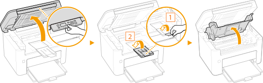 1. Lift the operation panel, close the paper stopper, and then open the toner cover.