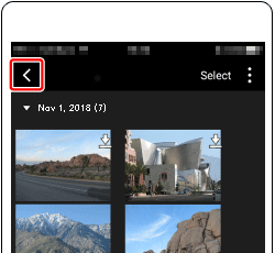 11. When the camera is connected to the smartphone, a list of the images on the camera will appear in Camera Connect. Tap [Select] appearing in the upper right of the screen.