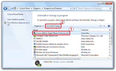 2. Select [Canon Utilities Digital Photo Professional 4] and click [Uninstall/Change].