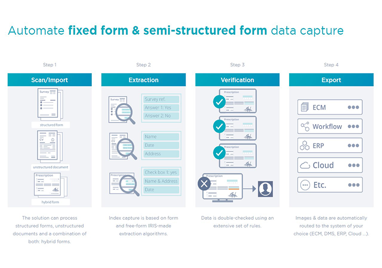 โซลูชั่นการประมวลผลขอมูลรูปแบบไฮบริด (Hybrid Forms Processing Solution) ของ IRIS จะสามารถดึงดัชนีจากรูปแบบของข้อมูลที่มีโครงสร้างชัดเจน ไม่มีโครงสร้าง และมีโครงสร้างแบบผสม เป็นการรวมเทคโนโลยีการจับข้อมูลทั้งหมดที่พัฒนาขึ้นโดย IRIS ไว้ในแอปพลิเคชันเดียว โดยมี IRISXtract™ ขับเคลื่อนโซลูชั่นในการจับข้อมูล วิเคราะห์ข้อมูล และกำหนดเส้นทางข้อมูลไปยังระบบเป้าหมายที่กำหนดเอาไว้ (ECM, DMS, ERP, ระบบคลาวด์ และอื่นๆ) ให้กับกระบวนการทางธุรกิจแบบอัตโนมัติที่ชาญฉลาด