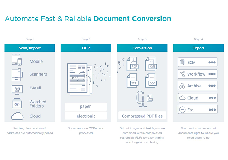 โซลูชั่นการแปลงเอกสาร (Document Converter Solution) ของ IRISXtract™ เป็นแอปพลิเคชันแบบโมดูลาร์ที่ปรับขนาดได้อย่างสมบูรณ์ โดยการแปลงเอกสารโดยอัตโนมัติให้เป็นไฟล์ที่สามารถสืบค้นได้อย่างสมบูรณ์และเป็นไฟล์ที่มีระดับการบีบอัดสูงเป็นพิเศษเพื่อใช้ในการแก้ไขและเก็บถาวรในระยะยาว เอกสารที่ผ่านการแปลงแล้วจะถูกส่งไปยังระบบเก็บถาวรหรือระบบจัดการหลังบ้านที่คุณกำหนดเพื่อการเข้าถึงที่รวดเร็วและง่ายดาย