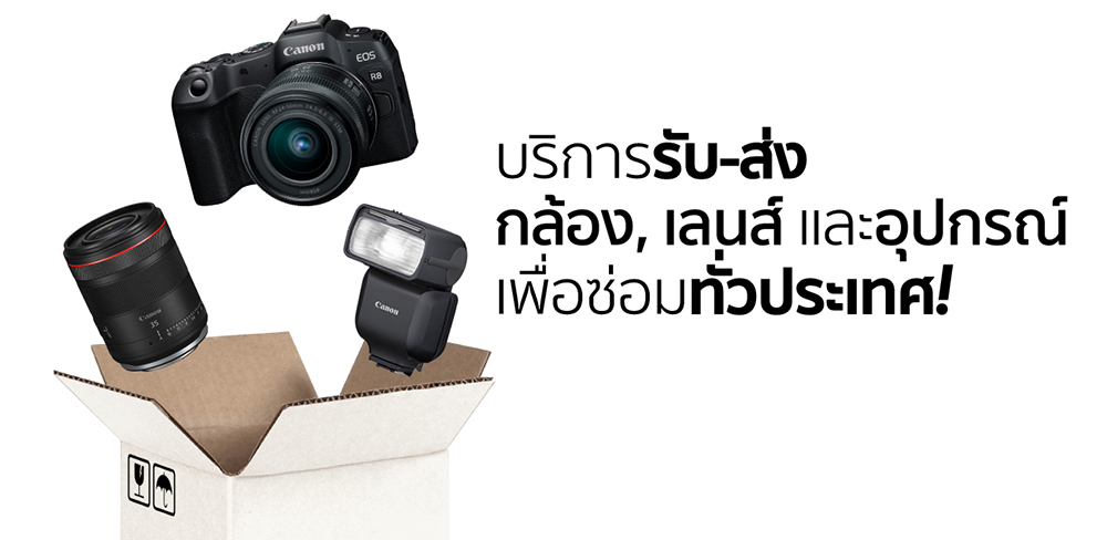 แคนนอน ยกระดับบริการที่สะดวกสบายเอาใจลูกค้าแบบขั้นสุด เปิดบริการ รับ-ส่ง ซ่อมกล้อง, เลนส์และอุปกรณ์ถ่ายภาพเพื่อซ่อมทั่วประเทศ ด้วยราคาเริ่มต้นเพียง 300 บาท (ไม่รวม Vat 7%) ครอบคลุมสินค้าหลากหลายรุ่น* ไม่จำกัดอาการเสีย ไม่จำกัดจำนวนกล่อง ให้บริการครอบคลุมพื้นที่ทั่วประเทศ**
