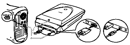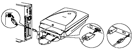 The connectors of USB cable have different shapes. Connect the wide flat connector of the USB cable to the computer, the small square one to the scanner.