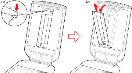 Hold the document cover so that it doesn't close, then (1) press down and hold the lever at the film guide's top left and (2) tilt the film guide outward and lift it up.