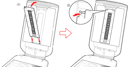 document cover (1), and then tilt the top of the Film Guide up into the document cover until it locks securely into place with a click (2).