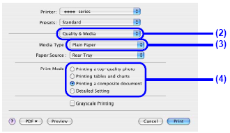 - When you select the print mode appropriate to your document in Print Mode, the document will be printed in color and at a print quality suited to the characteristics of the Media Type you have selected.