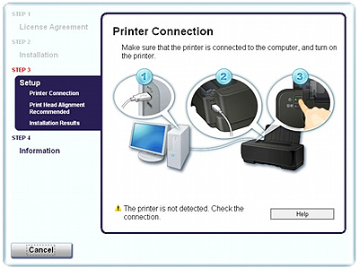 If you are unable to proceed beyond the Printer Connection screen, make sure that the USB cable is securely plugged into the USB port of the printer and is connected to the computer, and then follow the procedure below to reinstall the printer driver.