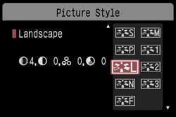 | Landscape | For vivid blues and greens, and very sharp and crisp images. Effective for impressive landscapes. This Picture Style is also selected automatically when the Mode Dial is set to < >. |