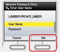 If the Enter Network Password screen is displayed after pressing [OK], enter your user name (up to 24 characters) and network password (up to 14 characters), then press the right Any key to select <Set>.