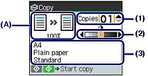 - The settings of the page size, media type, print quality, automatic intensity, etc. are retained, and these settings will appear next time when the Copy menu is selected even if the power is turned off and on.