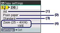 - To change or confirm the page size, media type, magnification (A), and other settings, press the Settings button.