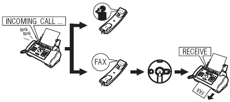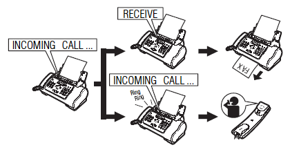 When you hear the telephone call ring pattern:Pick up the Handset and talk normally. If you hear a slow beep, it means the call is from a fax machine trying to send a document. Press [Start/Copy] to receive the document. If you do not pick up the Handset, the fax continues to ring until the other party hangs up. If an answering machine is connected, it takes over the call.