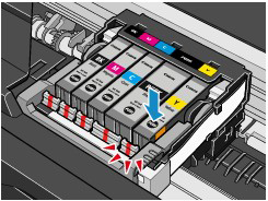 (Push) on the ink tank until the ink tank snaps firmly into place.Make sure that the ink lamp lights up red.