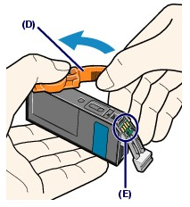 (2) Hold the orange protective cap (D) as indicated in the figure below, then twist and remove it from the bottom of the ink tank.