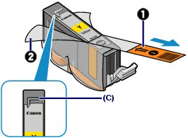 (1) Take a new ink tank out of its package, pull the orange tape (