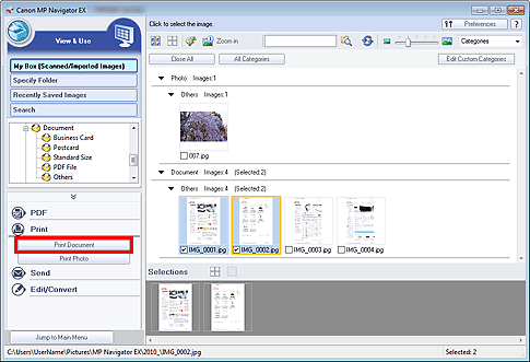 1. Scan documents into MP Navigator EX and save them, then open the View & Use window from the Navigation Mode screen and select images.