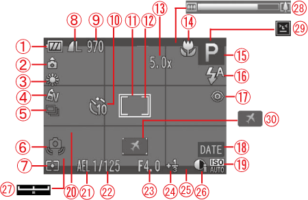 ![]() | Still Images : Recordable Shots Movies : Remaining Time | ![]() | Exposure Compensation Amount |