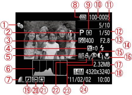 ![]() | Displayed image number / Total number of images | ![]() | Red-Eye Correction |