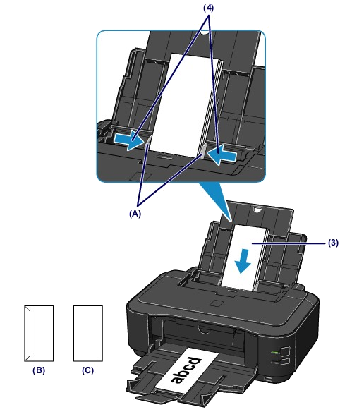 (3) Slide the paper guides (A) to open them, and load the envelopes in the center of the rear tray WITH THE ADDRESS SIDE FACING YOU.