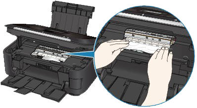 If the print head holder hangs over the paper, move the print head holder to the right edge or the left edge whichever is easier to remove the paper.