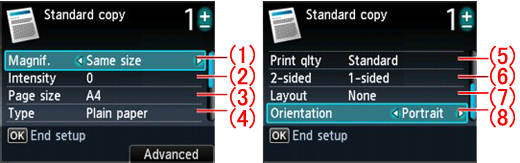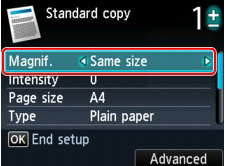 - Depending on the copy menu, some setting items cannot be selected. This section describes the setting items in Standard copy. The setting item which cannot be selected is displayed grayed out.