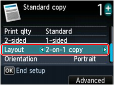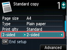 When you select 2-sided for 2-sided in Standard copy, you can copy two original pages onto the both sides of a single sheet of paper.
