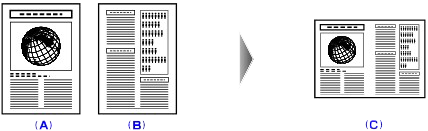 When you select 2-on-1 copy for Layout in Standard copy, you can copy two original pages (A) (B) onto a single sheet of paper (C) by reducing each image.