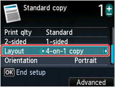 Touch the right Function button on the Copy standby screen to display the print settings screen, then select 4-on-1 copy for Layout.