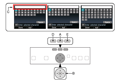 buttons (B) to select a character from the on-screen keyboard, then touch the OK button to enter it.Entered characters appear in the upper section (C) of the on-screen keyboard.