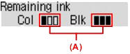 button to select Remaining ink, then press the OK button.Remaining ink is shown in four levels in the area (A).