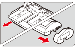 2. As shown in the following illustration, detach the charger’s protective cover (provided) and the battery’s protective cover (provided).