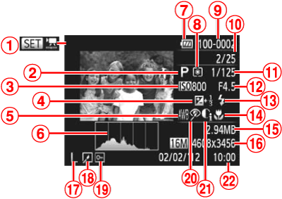 ![]() | Shutter speed (still images), Image quality / Frame rate (movies) | ![]() | Shooting date/time |