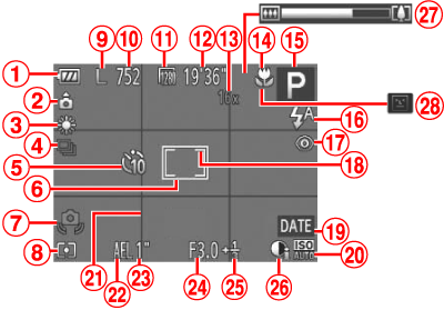 ![]() | Battery level | ![]() | Shooting mode, Scene icon |