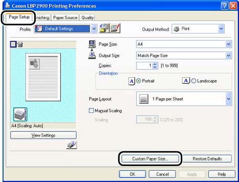 1. Display the [Page Setup] sheet, then click [Custom Paper Size].