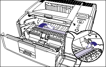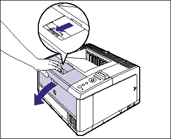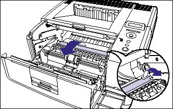 Press the green toner cover release tab (A) as shown in the figure.