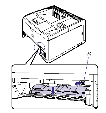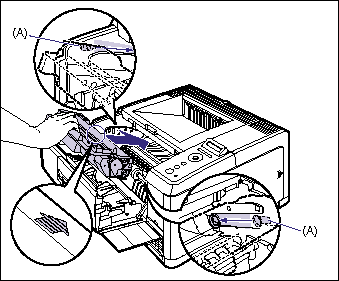 23. Push the toner cartridge into the printer until it touches the back of the printer while aligning (A) on both sides of the toner cartridge with the toner cartridge guides inside the printer.