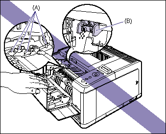 e. Be sure not to touch the high-voltage contacts (A) or electrical contact (B) shown in the figure, as this may result in damage to the printer.