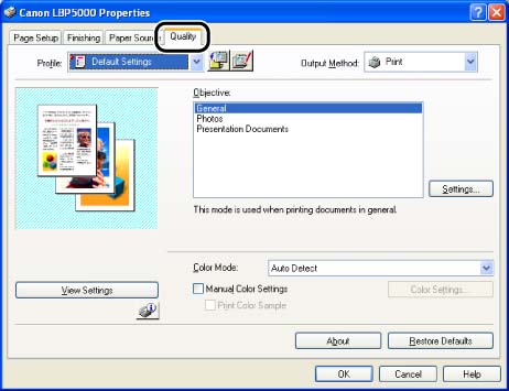 c. If you display the [Document Properties] dialog box from the [Printers and Faxes] folder or [Printers] folder (Windows 2000/XP/Server 2003); or if you display the [Printer Properties] dialog box from the [Printers] folder (Windows 98/Me), you can specify the default settings for all jobs.