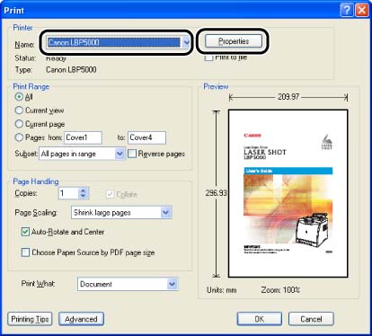 2. Select the name of this printer for [Name] or [Printer Name], and then click [Properties].