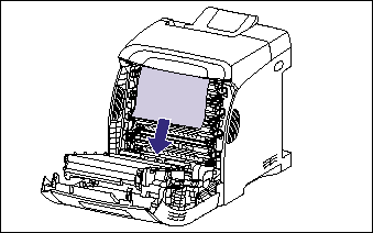 Remove the jammed paper in the direction of the arrow gently to prevent unfixed toner from spilling. Remove the paper, being careful not to touch the transfer belt of the ETB unit or toner cartridge.