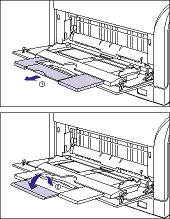 When loading long-size paper such as A3 and A4, pull out the auxiliary tray (1), and then open the tray extension (2).